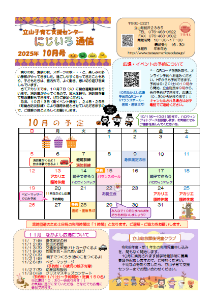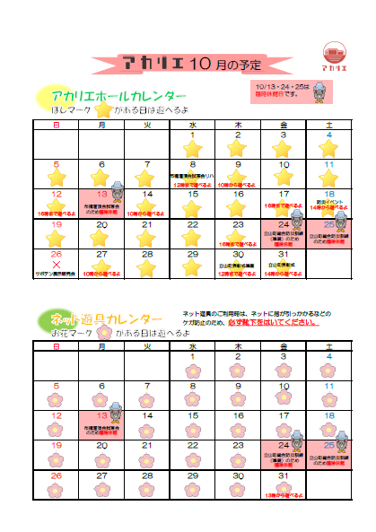 10月は臨時休館やイベント等で、ホールやネット遊具の利用時間に変更が多いため
